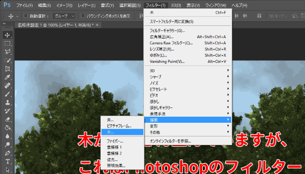 なぜフィルターの中にあるのかっていうのがいまいちわかりませんが、とにかくフィルターメニューの中にあります。木はフィルターか?