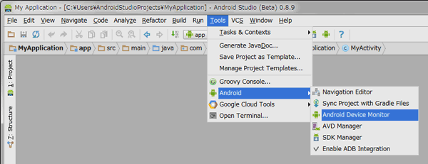 次に Android Studio をインストールして起動し、Tools → Android → Android Device Monitor をクリックします。