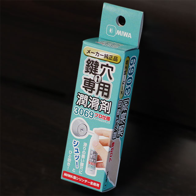 コレです。美和ロック(MIWA) 純正 鍵穴専用潤滑剤 スプレー 3069S プロ仕様 12ml。